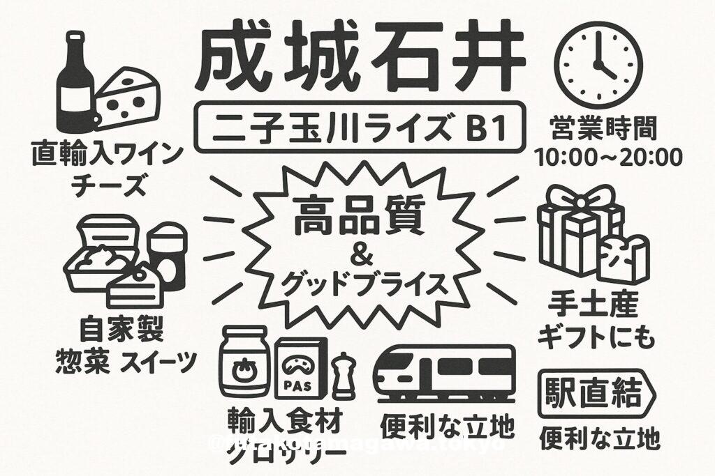 フリーキーワード | 二子玉川ライズB1の〈成城石井 二子玉川東急フードショー店〉は、直輸入ワインやチーズ、自家製惣菜やスイーツが揃う高品質スーパーです。手土産やギフトにもぴったりの商品が並び、駅直結の便利な立地で営業時間は10:00〜20:00。ザ・グルメパントリー内に位置し、「高品質&グッドプライス」をモットーに輸入菓子、スパイス、ナッツ、パスタソースなども充実。オンラインショップ「成城石井.com」からも購入でき、家飲みや週末のまとめ買い、デリ、プリン、ラザニアなど幅広いニーズに応えます。 |