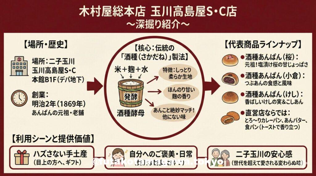 二子玉川でのショッピングや散策の帰り道、ふと立ち寄りたくなるのが玉川高島屋S・Cのデパ地下(本館B1F)。数ある名店の中でも、独特の香ばしい香りで人を惹きつけるのが**「木村屋総本店 玉川高島屋S・C店」**です。