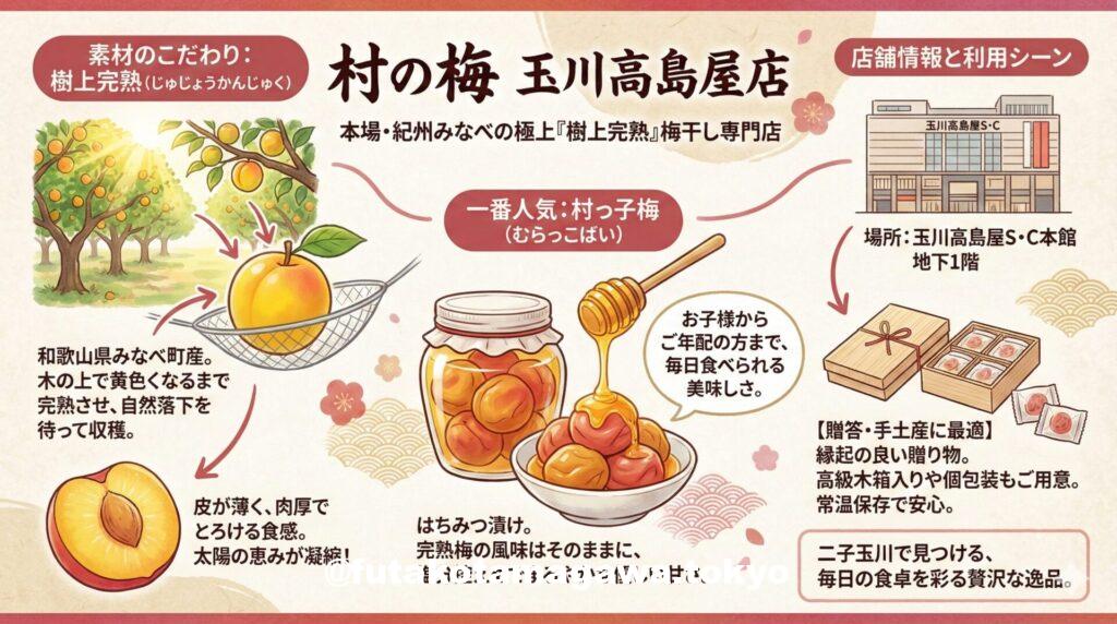 毎日の食卓に、ほんの少しの贅沢と健康を。 二子玉川駅すぐ、玉川高島屋S·C本館の地下1階に店を構える「村の梅(むらのうめ)」は、本場・和歌山県みなべ町から直送される最高級の「紀州南高梅」を取り扱う専門店です。