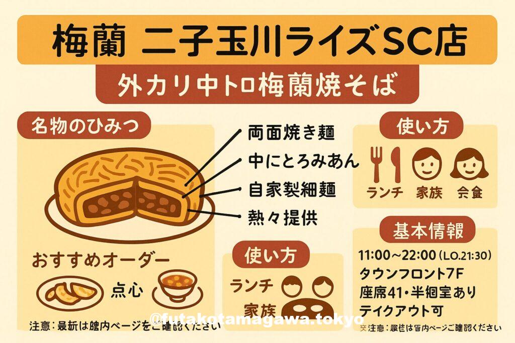 フリーキーワード | 二子玉川ライズ7F「梅蘭」は、外はカリッと中はとろりの梅蘭焼きそばで知られる中華料理店。11:00〜22:00(L.O.21:30)、座席41・半個室ありでディナー予約可。子ども椅子や離乳食温めなど家族に優しい設備も魅力。テイクアウトも対応、ランチ1,000円台から楽しめます。買い物ついでの一皿から軽い会食まで、二子玉川の日常をちょっと特別に。 |