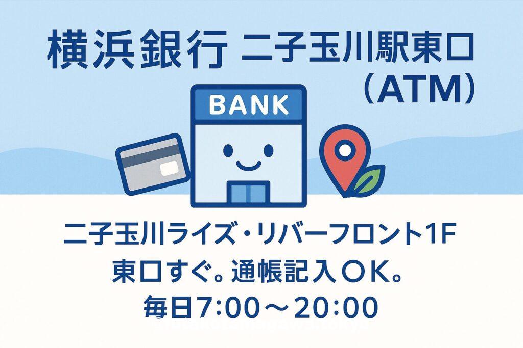 東口すぐ、二子玉川ライズ1Fの横浜銀行ATM。全日7:00〜20:00、通帳記入OK・はまぎん宝くじ対応。