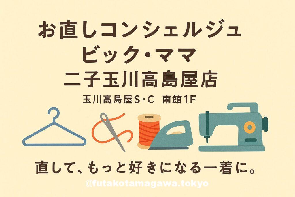 フリーキーワード二子玉川駅からすぐ、玉川高島屋S・C南館1Fの「お直しコンシェルジュ ビック・ママ 二子玉川高島屋店」は、洋服直しからバッグ・靴・アクセサリーの修理、通園バッグのオーダーまで相談できるお直し専門店。パンツの裾上げやサイズ直しはもちろん、思い出の一着を今の自分に合う形へリメイクする提案も得意です。二子玉川で“直して着る”暮らしを始めたい人にぴったりの一軒です。