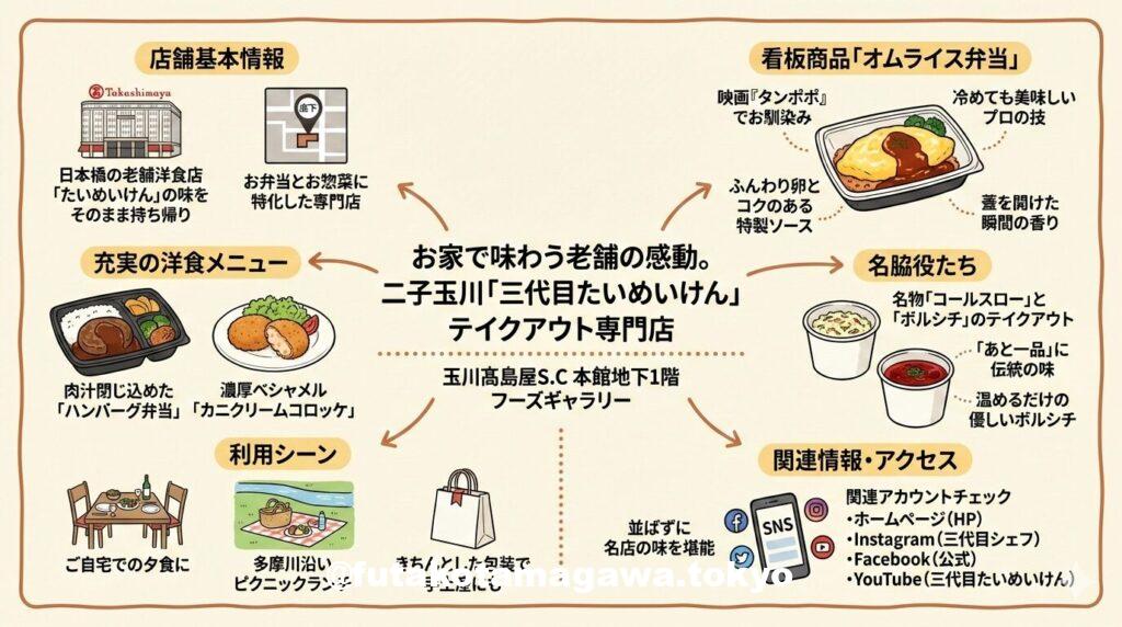| フリーキーワード | 日本橋の名店「たいめいけん」の味を、二子玉川のデパ地下でお手軽に。玉川髙島屋本館B1Fにあるこちらの店舗は、お弁当とお惣菜のテイクアウト専門店です。ふんわり卵の「オムライス弁当」や、ジューシーな「ハンバーグ」など、老舗の洋食メニューがずらり。名物ボルシチやコールスローもカップで販売されており、夕食のプラス一品や、多摩川沿いでの優雅なピクニックランチにぴったりです。 |