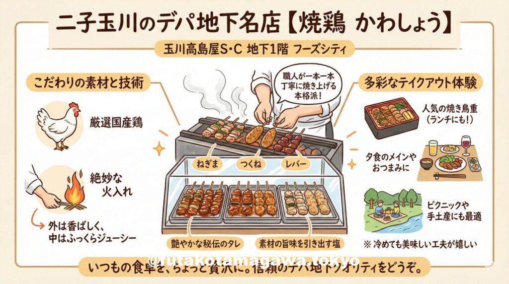 東急田園都市線・大井町線の二子玉川駅から徒歩ですぐ。洗練されたショップが並ぶ「玉川高島屋S・C」の地下1階フーズシティで、一際食欲をそそる香りを漂わせているのが**「焼鶏 かわしょう」**です。