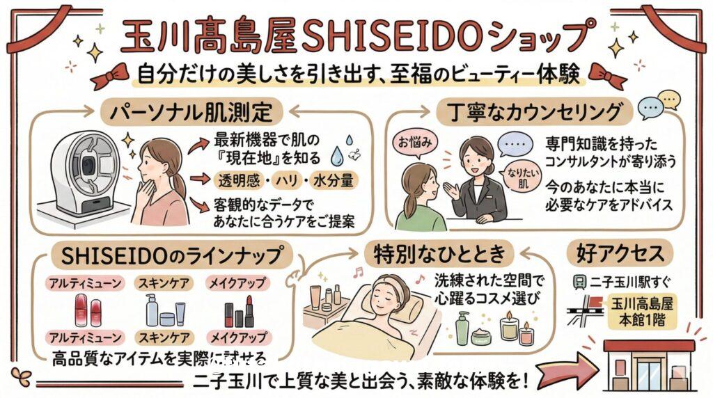 洗練された大人の街、二子玉川。ショッピングやグルメを楽しむ人々で賑わうこの街のランドマーク「玉川高島屋」の本館1階に、グローバルブランド「SHISEIDO」の魅力が詰まったショップがあります。今回は、毎日のスキンケアやメイクアップをワンランク上の体験へと導いてくれる「玉川髙島屋SHISEIDOショップ」の魅力をご紹介します。