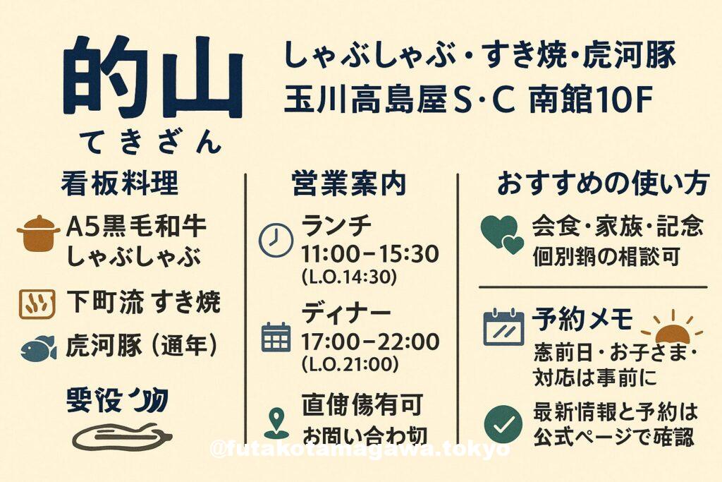 フリーキーワード | 玉川高島屋S・C南館10F〈的山〉は、A5黒毛和牛のしゃぶしゃぶ・すき焼、通年の虎河豚鍋が要。自家仕込みのぽん酢や胡麻だれ、キレのある割下で“旨味の輪郭”を描く和食店です。買い物帰りのランチから会食ディナーまで、落ち着いた和空間で幅広く対応。最新の営業時間・予約は公式と館ページをチェック。 |