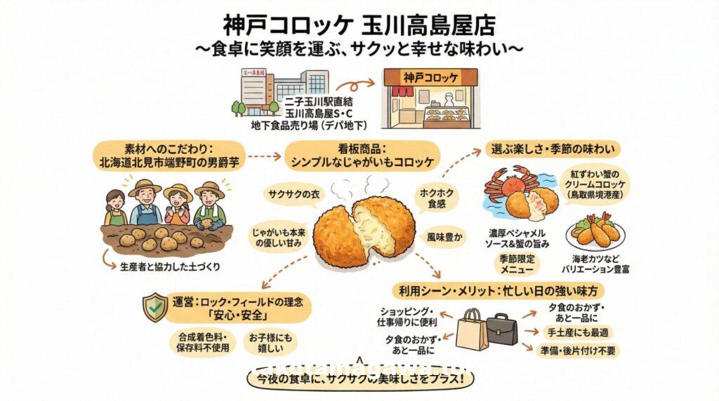 二子玉川駅直結、玉川高島屋S・Cの地下食品売り場(デパ地下)。数多くの名店がひしめくこの場所で、長年愛され続けているのが**「神戸コロッケ 玉川高島屋店」**です。