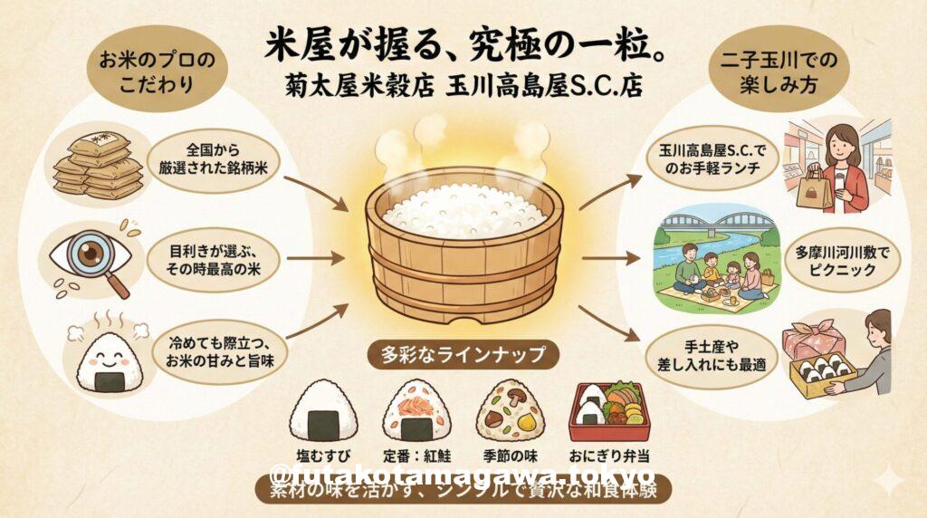 多摩川の自然と洗練されたショッピングエリアが共存する街、二子玉川。この地で、多くのグルメファンや近隣住民から絶大な支持を得ているのが「米屋のおにぎり屋 菊太屋米穀店 玉川高島屋S.C.店」です。