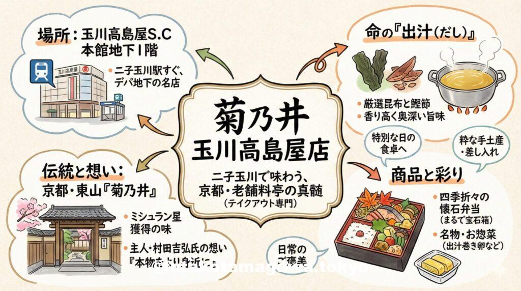伝統を守りながらも、現代の食卓に寄り添う「菊乃井 玉川高島屋店」。 まずは一度、その繊細な出汁の味を体験してみてください。日々の喧騒を忘れさせてくれるような、優雅で豊かな京の味が、あなたを待っています。