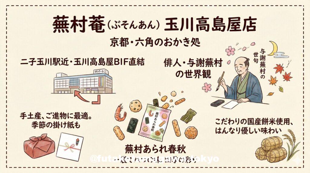 二子玉川駅すぐ、玉川高島屋S・Cの本館地下一階。数多くの名店がひしめくデパ地下の一角に、ふわりと京都の風を運んでくれるお店があります。それが、京都・六角に本店を構えるおかき処**「蕪村菴(ぶそんあん)」**です。