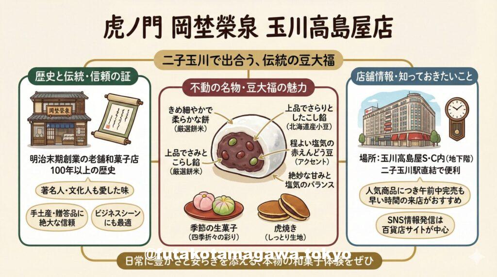 ■ 手土産に選ばれる「信頼感」 二子玉川という土地柄、大切な方への手土産を探される方も多いでしょう。岡埜榮泉の和菓子は、その歴史と品格から、ビジネスシーンや目上の方への贈り物としても絶大な信頼を得ています。 豆大福のほかにも、しっとりとした生地で餡を包んだ「虎焼き」や、季節の素材を活かした生菓子など、四季折々の彩りを楽しむことができます。特に玉川高島屋店は、百貨店内という利便性の高さから、お買い物帰りや急な入り用の際にも立ち寄りやすいのが魅力です。