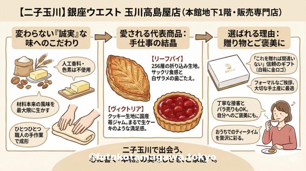 | フリーキーワード | 二子玉川・玉川高島屋の地下1階に位置する、手土産の鉄板ブランド「銀座ウエスト」。看板商品のリーフパイや、苺ジャムが宝石のように輝くヴィクトリアなど、人工香料を使わない実直な焼き菓子が揃います。白地に金ロゴのパッケージは品格があり、フォーマルな贈り物から自分へのご褒美まで幅広く対応。丁寧な接客も心地よく、二子玉川で「失敗しないギフト」を探すなら、まずはここを訪れれば間違いありません。 |