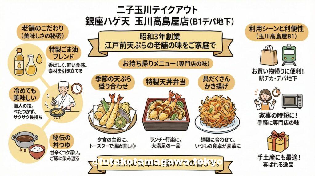 | フリーキーワード | 二子玉川の玉川高島屋B1、デパ地下に位置する「銀座ハゲ天」は、昭和3年創業の伝統を誇る天ぷらのテイクアウト専門店です。独自ブレンドの胡麻油でカラッと揚げた天ぷらは、冷めても風味が落ちず、ご家庭での夕食や手土産に最適。季節の野菜や海老を使った盛り合わせから、秘伝のタレが決め手の天丼弁当まで、老舗の味を手軽に楽しめます。お買い物帰りに立ち寄り、今夜の食卓を「専門店の味」で彩ってみませんか。 |