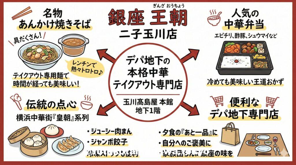 | フリーキーワード | 玉川髙島屋本館の地下1階にある「銀座 王朝」は、銀座の名店のエッセンスを詰め込んだ中華惣菜・お弁当のテイクアウト専門店です。一番人気は、別添えの餡をかけて仕上げる「あんかけ焼きそば」。具だくさんで満足度が高く、リピーターの多い一品です。その他、エビチリや酢豚が入ったお弁当や、系列である横浜中華街「皇朝」の肉まん・餃子も購入可能。二子玉川での買い物帰り、手軽に本格的な味を持ち帰りたい時に重宝します。 |