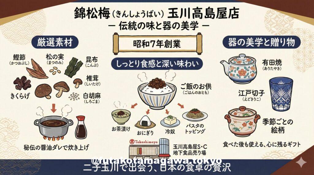 二子玉川駅を降り、玉川高島屋の地下食品売り場へと足を運ぶと、どこか懐かしく、そして凛とした空気を纏う一角があります。それが、昭和の創業以来、多くの食通たちを唸らせてきた「錦松梅(きんしょうばい)」です。