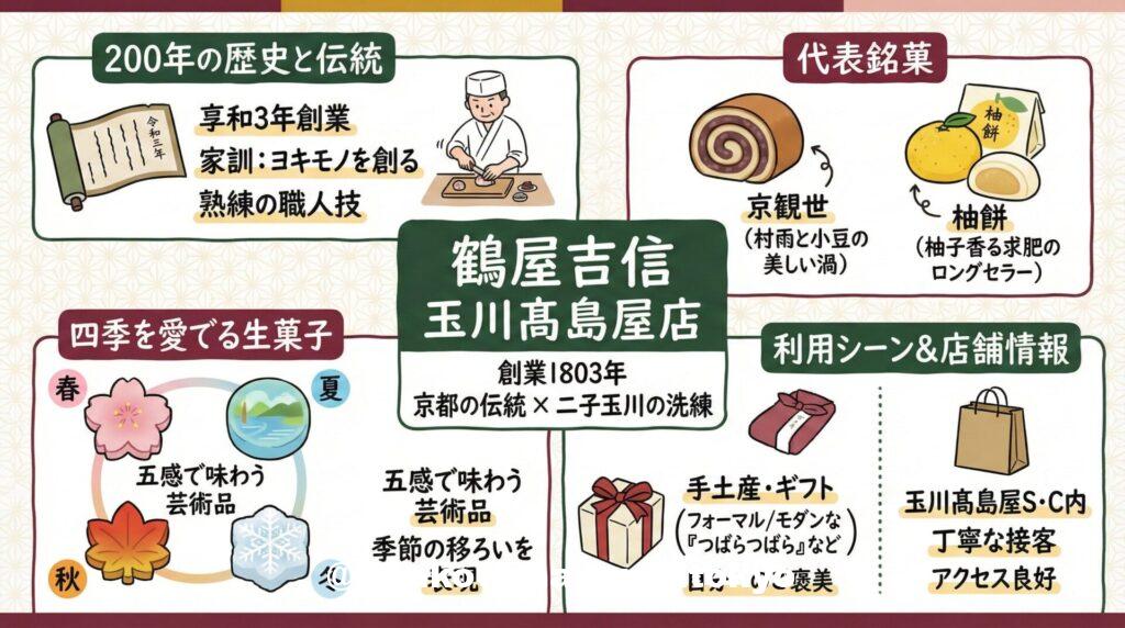 多摩川の自然と洗練されたショッピングエリアが共存する街、二子玉川。その中心に位置する玉川髙島屋S・Cの中に、江戸時代から続く京都の伝統を肌で感じられる場所があります。それが、享和3年(1803年)創業の京菓子の老舗「鶴屋吉信(つるやよしのぶ)玉川髙島屋店」です。