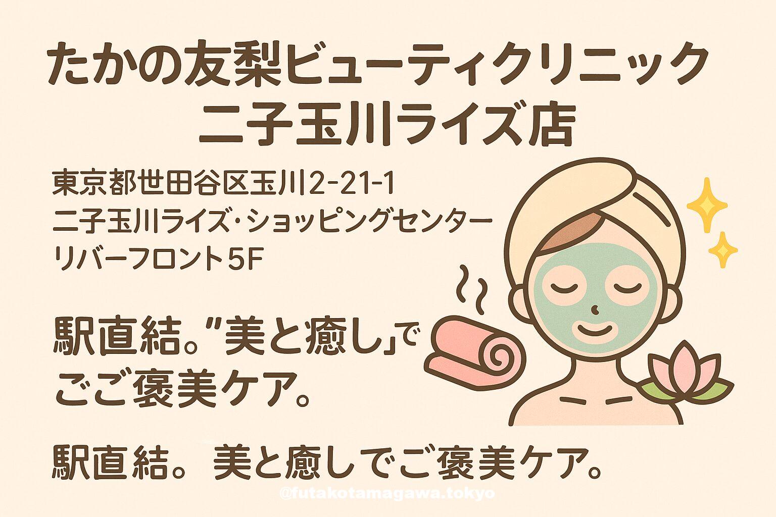 写真 ひとこと紹介文 駅直結の二子玉川ライズ・リバーフロント5F。たかの友梨ビューティクリニックで、フェイシャルもボディも“癒し×結果”を両立。平日・土は20:30まで、通いやすさも魅力。 二子玉川ライズ+1 地図 AI紹介文(ChatGPT5編) 「今日は自分を底上げしたい」――そんな日に頼れるのが、二子玉川ライズ・ショッピングセンター リバーフロント5Fの〈たかの友梨ビューティクリニック 二子玉川ライズ店〉。東急田園都市線・大井町線「二子玉川」駅から東口直結で徒歩1分。平日・土は10:00〜20:30 ...