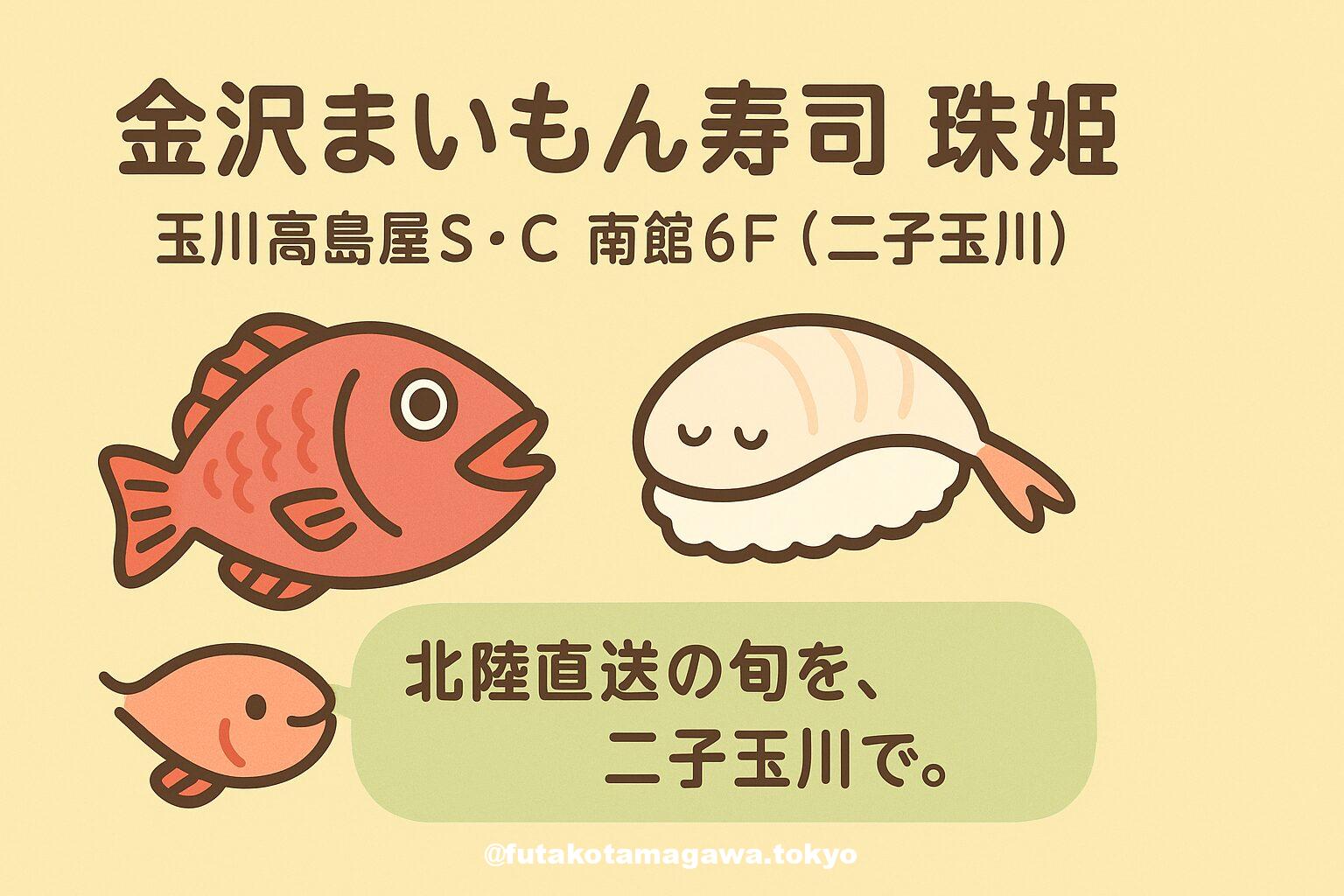 写真 ひとこと紹介文 北陸直送の旬を、都会的な設えで。玉川高島屋S・C南館6F「金沢まいもん寿司 珠姫」で、のどぐろや白えびを気品ある一皿で堪能。 地図 AI紹介文(ChatGPT5編) 二子玉川にいながら、北陸の波音が聞こえてくる。――そんな錯覚を誘うのが玉川高島屋S・C南館6Fの「金沢まいもん寿司 珠姫」。港から届く鮮魚の力強さを、粋な所作で一貫に仕立てる“ごちそう寿司”が看板です。とりわけ必食は、北陸で“白身のトロ”と称される〈のどぐろ〉。脂がきめ細やかに広がり、米と酢の輪郭をやわらかく包みます。富 ...