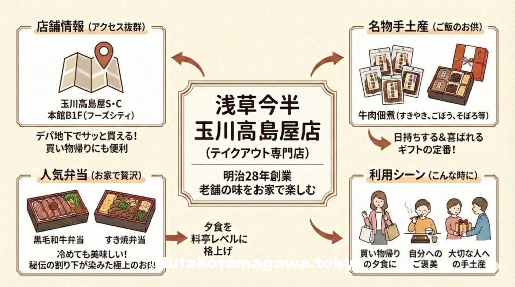 二子玉川駅周辺でショッピングを楽しんだ帰り道。「今日の夕飯は、家でゆっくり美味しいものが食べたいな」と思ったことはありませんか? そんな時にぜひ立ち寄っていただきたいのが、玉川高島屋S・C 本館地下1階にある**「浅草今半 玉川高島屋店」**です。