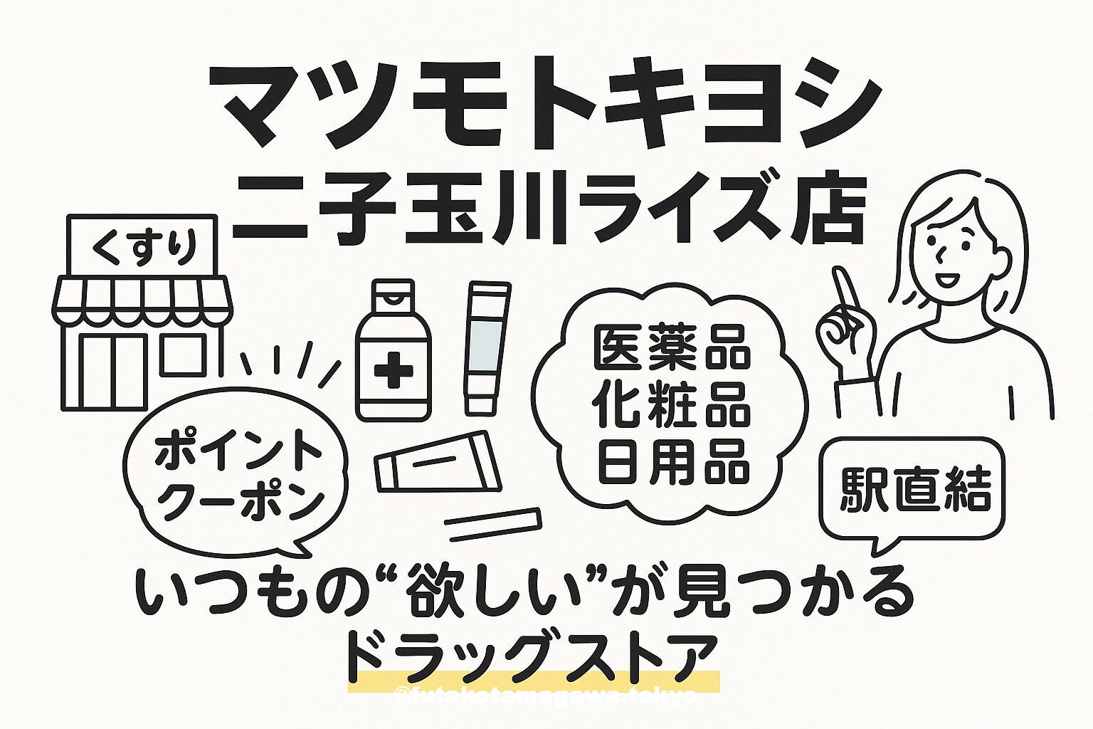 フリーキーワード | 二子玉川駅直結のマツモトキヨシでは、医薬品・日用品・コスメが充実。トレンドアイテムも揃い、ポイントサービスやキャッシュレス決済対応で便利です。 |