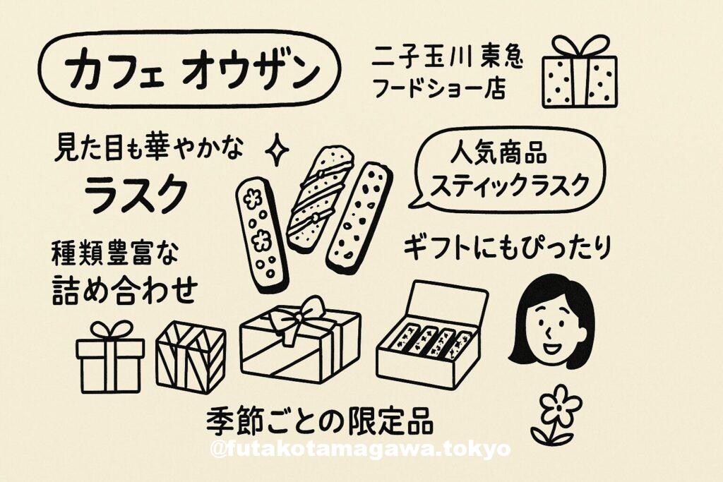 フリーキーワード | 宝石のような見た目にワクワクする手作りラスク専門店、カフェ オウザン。二子玉川ライズ地下1階で、贈り物にぴったりな美しさと味を兼ね備えたスイーツが並びます。キューブラスクやクロワッサンラスクはフォトジェニックで、飾りたくなる華やかさ。ギフトや自分へのご褒美に、一度立ち寄ってみたいお店です。 |