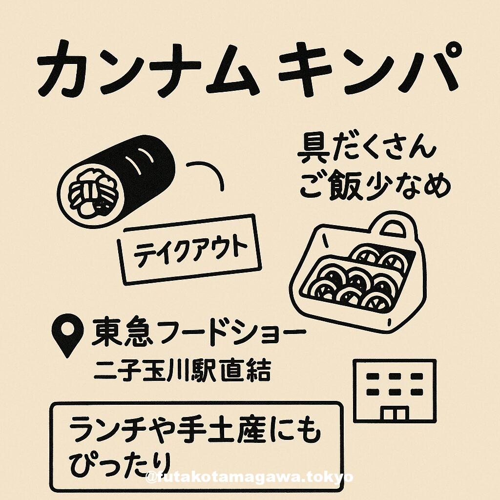 フリーキーワード | 具だくさんでご飯控えめの韓国式海苔巻きを、二子玉川駅直結の東急フードショーで楽しめる「カンナムキンパ」。プルコギやクリームチーズなどバラエティ豊富なキンパは、サクっとテイクアウトできてランチや手土産にぴったり。10:00〜20:00営業でいつでも本場の味に出会える、気軽で頼もしい韓国惣菜の専門店です。 |