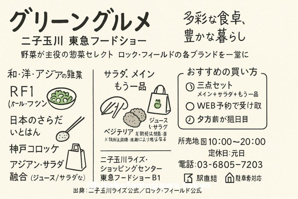 フリーキーワード | 二子玉川ライズB1「グリーン・グルメ」は、RF1が手がける惣菜セレクト。和・洋・アジアのサラダやメインがずらり並び、“野菜たっぷり×満足感”が両立。駅直結で立ち寄りやすく、10:00〜20:00営業。今日はサラダ+メイン+もう一品で、手早く上質な食卓に。 |