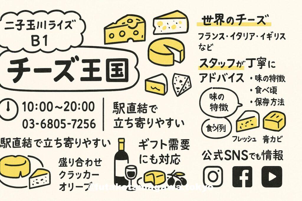 フリーキーワード | 二子玉川ライズB1「チーズ王国」は、世界のチーズを最良の状態で届ける専門店。フレッシュから青カビ、ハード、シェーブルまで幅広く、食べ頃や保存、ペアリングも丁寧に提案。贈り物の盛り合わせから家飲みの少量買いまで頼れる一軒です。営業時間10:00〜20:00、東急フードショー内。 |
