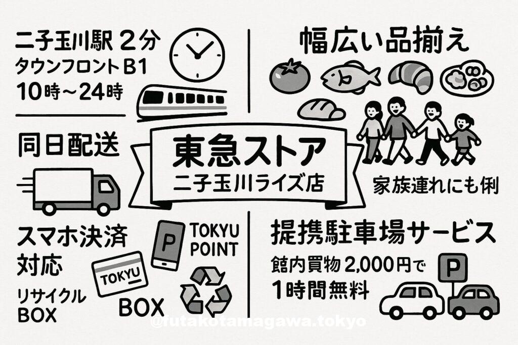 フリーキーワード | 二子玉川, 東急ストア, 二子玉川ライズ, タウンフロントB1, 駅近スーパー, 10時〜24時, 当日お届け, スマホ決済, TOKYU POINT, 駐車場サービス, 仕事帰り, まとめ買い, 惣菜, ベーカリー, ワイン, 日用品, リサイクルボックス, 家族連れ, 一人暮らし, 二子玉川の買い物拠点。 |