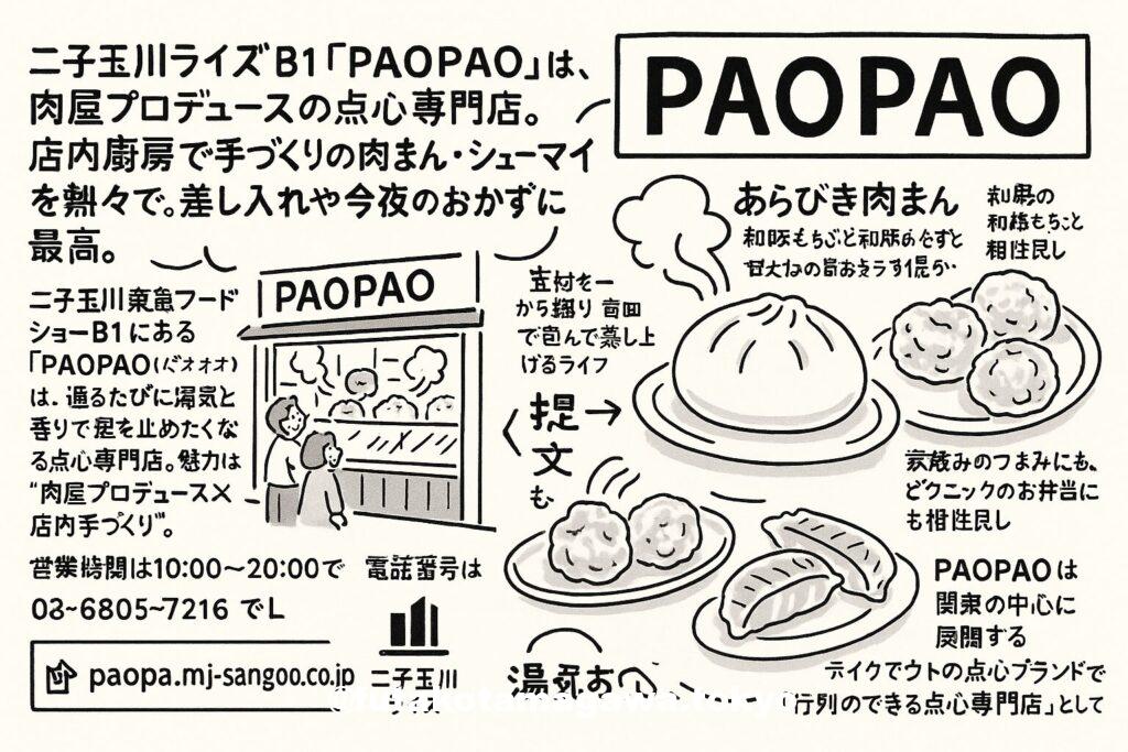 フリーキーワード | 二子玉川ライズB1「PAOPAO」は、店内厨房で包む“できたて”が信条の点心専門店。和豚もちぶたの肉まん、ジューシーな黒豚シューマイ、ギョーザや水餃子まで、晩ごはんの主役にも差し入れにも万能。駅近で買いやすく、東急フードショーの買い回りにも便利。湯気ごと持ち帰る幸せを二子玉川で。 |