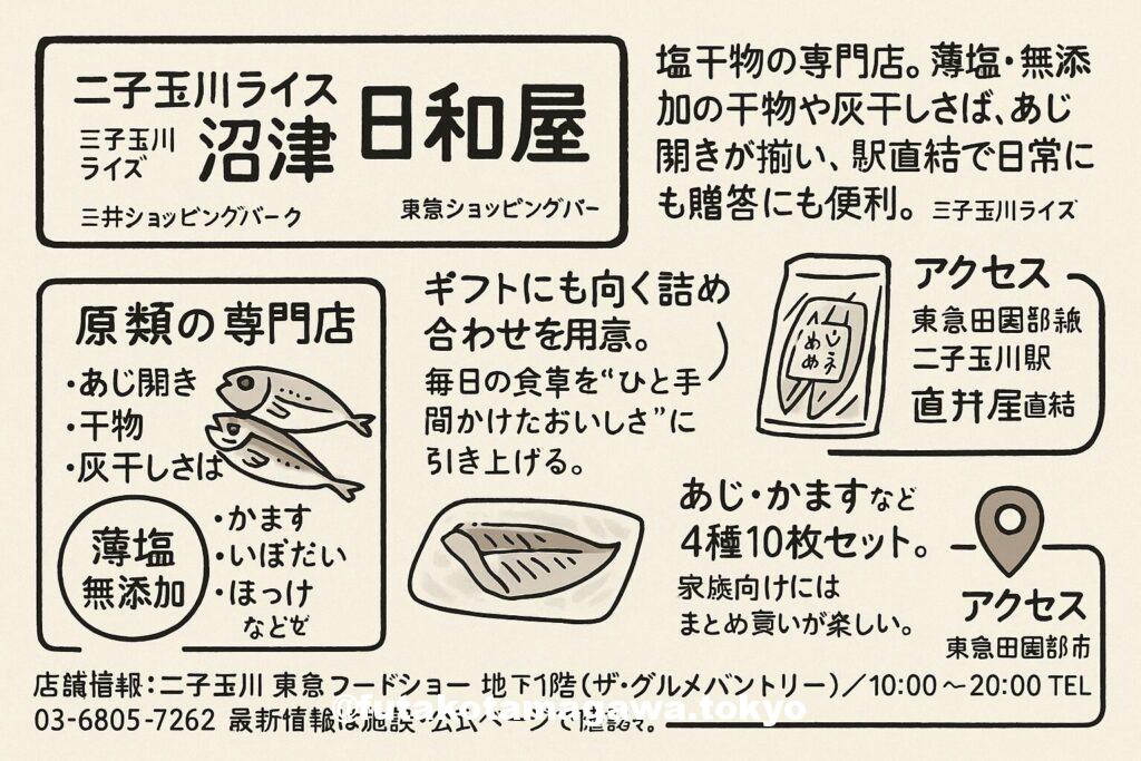 フリーキーワード | 二子玉川ライズB1「沼津日和屋」は、薄塩・無添加の塩干物専門店。あじ開き、かます、いぼだい、ほっけ、そして人気の“灰干しさば”まで、焼くだけで主菜が決まる実力派が揃う。駅直結で買い回りもスムーズ。詰め合わせは贈答にも最適。今夜の一枚は、二子玉川の「沼津日和屋」で。 |