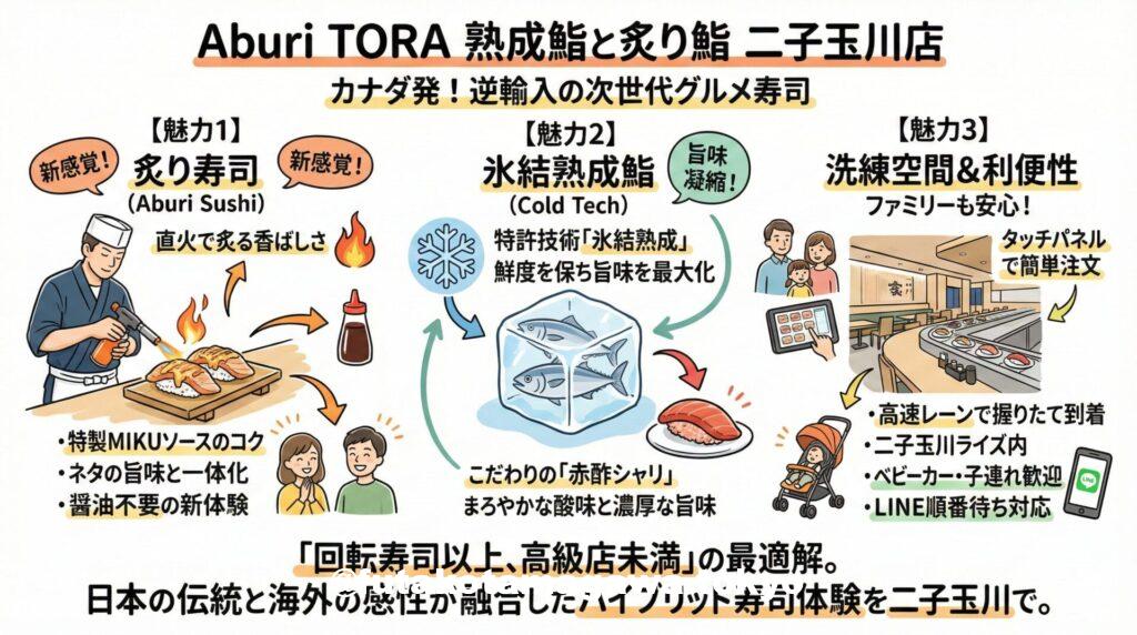 二子玉川駅直結、二子玉川ライズ タウンフロント7Fに位置する**「Aburi TORA 熟成鮨と炙り鮨 二子玉川店」。 ここは単なる回転寿司ではありません。カナダ・バンクーバーで「寿司革命」を起こした名店が、日本へ逆輸入という形で凱旋オープンさせた、まさに「次世代のグルメ寿司」**です。