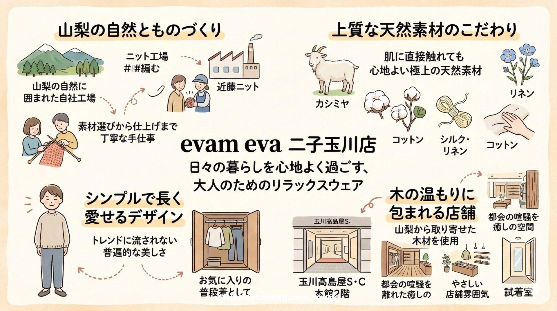 写真 ひとこと紹介文 玉川髙島屋S・C本館2階にある「evam eva 二子玉川店」。上質な天然素材とシンプルなデザインで、日々の暮らしに寄り添う大人のためのウェアが揃います。木の温もりを感じる店内で、心地よい一着との出会いをお楽しみください。 地図 AI紹介文(Gemini3編) 【二子玉川】心地よい暮らしに寄り添う天然素材の服「evam eva 二子玉川店」で上質な日常を 豊かな自然と洗練された都市の空気がゆるやかに交差する街、二子玉川。この街で上質なライフスタイルを求める大人たちから愛され続けている ...
