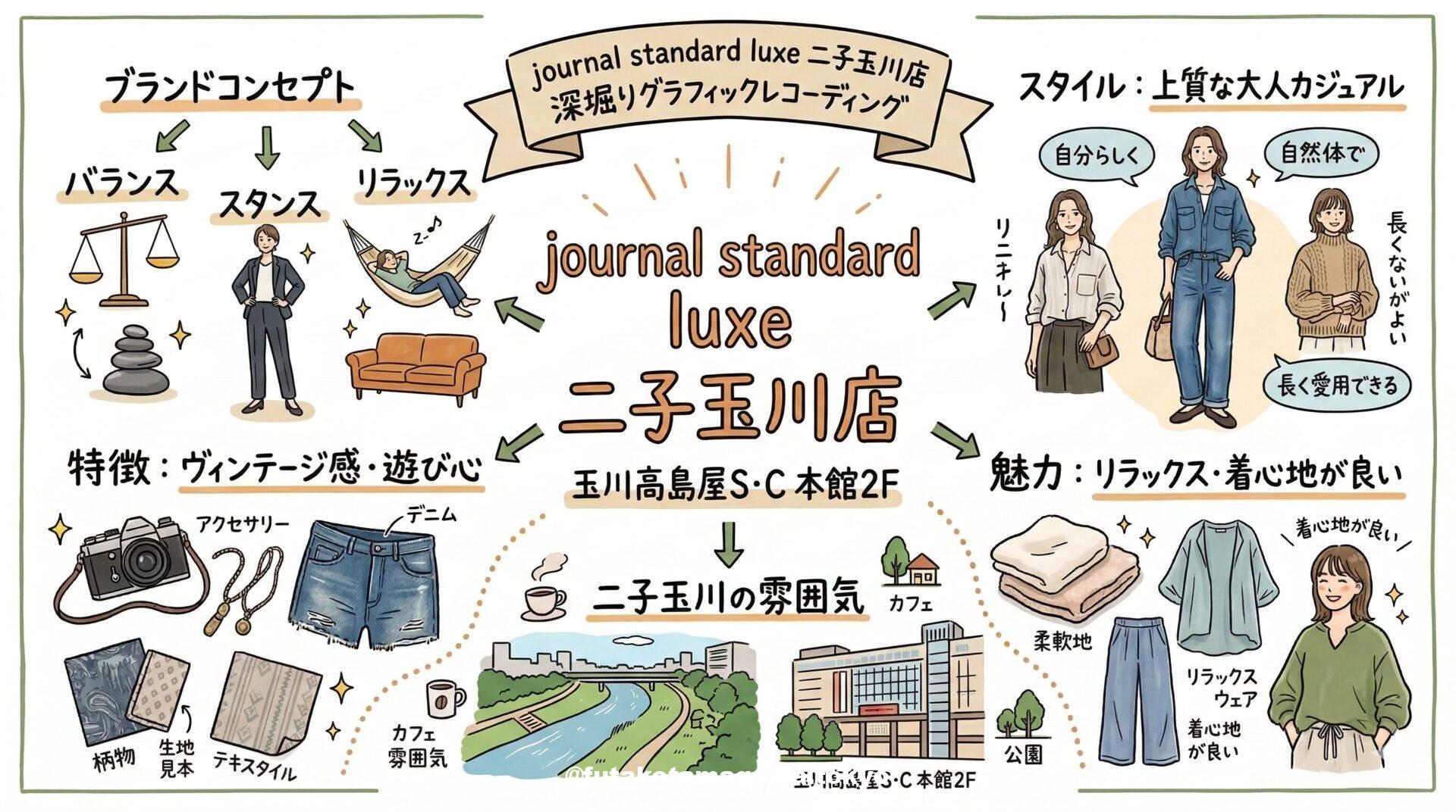 写真 ひとこと紹介文 二子玉川で上質な大人カジュアルを探すなら「journal standard luxe 二子玉川店」。ヴィンテージ感やリラックス感をテーマにした、着心地の良いアイテムが揃う、自然体のスタイルを楽しむ女性におすすめのショップです。 地図 AI紹介文(Gemini3編) 二子玉川で叶える、心地よい大人のカジュアルスタイル 二子玉川駅を出てすぐ、洗練されたショップが立ち並ぶ玉川高島屋S・C。その中に、自然体で上質なファッションを提案する「journal standard luxe(ジャーナル ...