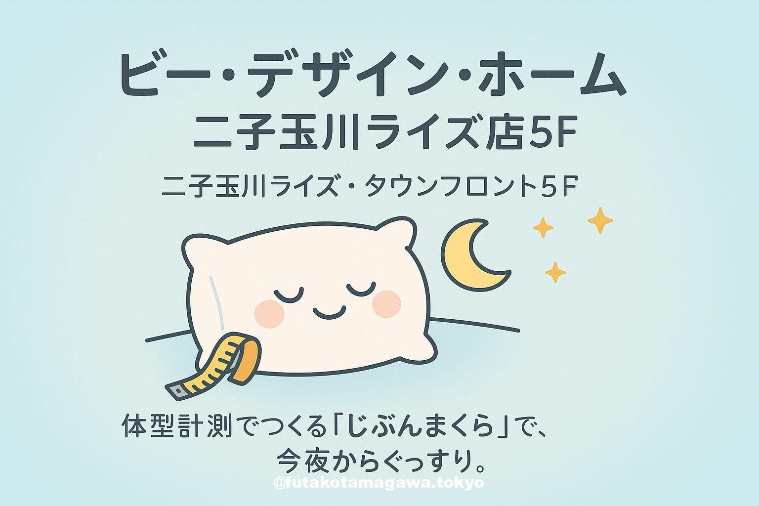 写真 ひとこと紹介文 二子玉川ライズ5F「B-design home.」は、体型計測で作る“じぶんまくら”と快眠雑貨・AMACAコラボのルームウェアが揃う、睡眠改善に強い専門店。 二子玉川ライズ+1 地図 AI紹介文(ChatGPT5編) 二子玉川ライズ・タウンフロント5Fの「B-design home.(ビーデザイン ホーム)」は、“よく眠れる毎日”をデザインする寝具・生活雑貨の専門店です。店頭では、一人ひとりの体型を専用機器で計測し、データに基づいて中材と高さを調整するオーダーメイド枕「じぶんまくら」 ...