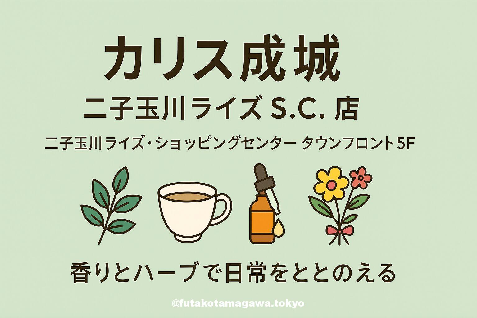 写真 ひとこと紹介文 ハーブとアロマの専門店「カリス成城」。二子玉川ライズ5Fで、ハーブティーから精油、ギフトまで。香りと癒しの提案で“日常をととのえる”一品に出会えます。 二子玉川ライズ 地図 AI紹介文(ChatGPT5編) 二子玉川ライズ S.C. タウンフロント5Fにある「カリス成城」は、1983年に東京・成城で創業した日本初のハーブショップをルーツに持つ、ハーブ&アロマの専門店です。店内にはブレンドハーブティーや単品ハーブ、エッセンシャルオイル(精油)、キャリアオイル、バスソルト、ナチュラルコス ...