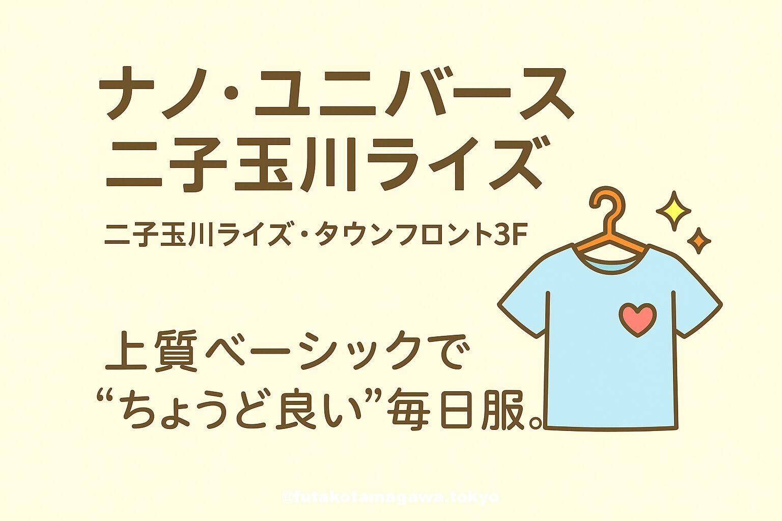 写真 ひとこと紹介文 二子玉川ライズ・タウンフロント3Fのナノ・ユニバース。モダン&上質な日常着と旬のセレクトで、男女ともに“ちょうど良い”都会のワードローブが整います。 二子玉川ライズ 地図 AI紹介文(ChatGPT5編) “いま”の空気を取り込みながら、長く着られる。二子玉川ライズ・タウンフロント3Fの「ナノ・ユニバース」は、メンズ・ウィメンズともに日常をアップデートする定番とトレンドを絶妙にミックスしたショップです。ブランドの世界観は「ジャパン・メイド・トラディショナル」「モダン・ヴィンテージ」「 ...