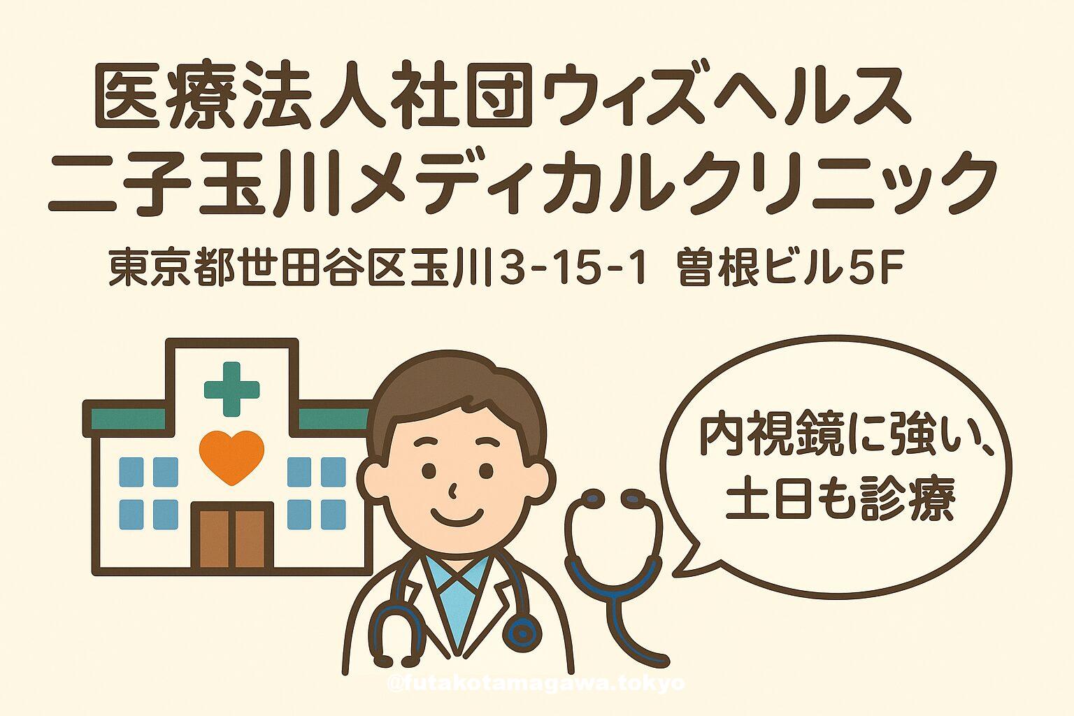 写真 ひとこと紹介文 二子玉川駅西口徒歩3分。土日も17時まで診療し、内科・消化器内科・内視鏡に強み。健康診断・人間ドックも実施する地域密着の総合内科クリニック。 地図 AI紹介文(ChatGPT5編) 二子玉川ライズの賑わいから徒歩3分。医療法人社団ウィズヘルス 二子玉川メディカルクリニックは、内科・消化器内科・内視鏡内科・肝臓内科・アレルギー科を掲げる総合内科クリニックです。所在地は東京都世田谷区玉川3-15-1 曽根ビル5F、代表電話は03-3707-7720。アクセスは東急田園都市線/大井町線「二 ...