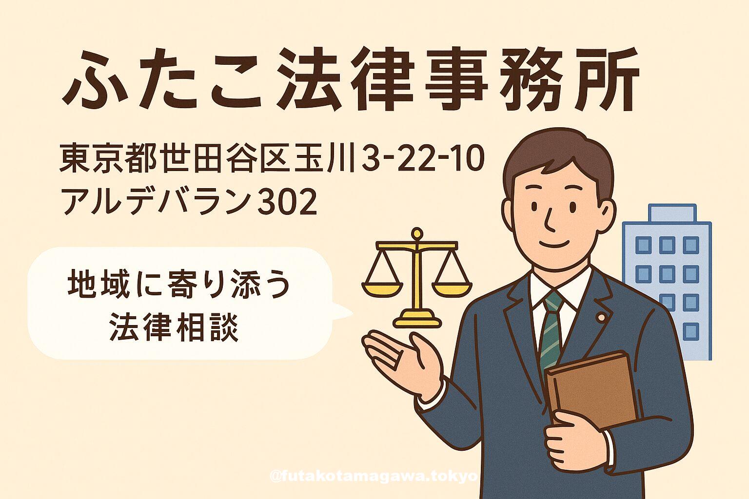 写真 ひとこと紹介文 二子玉川駅徒歩6分。離婚・交通事故・賃貸トラブルをはじめ、相続や刑事まで幅広く対応。30分5,500円の有料相談で、納得感ある解決の道筋を提案。 地図 AI紹介文(ChatGPT5編) 東急・二子玉川駅から徒歩6分。ふたこ法律事務所は、地域密着を掲げる個人経営の法律事務所です。住所は世田谷区玉川3-22-10 アルデバラン302、電話番号は050-5369-5250。平日9:00〜18:00の運営で、来所が難しい相談者には公式LINEやGoogle Meetを活用した連絡・面談にも対 ...