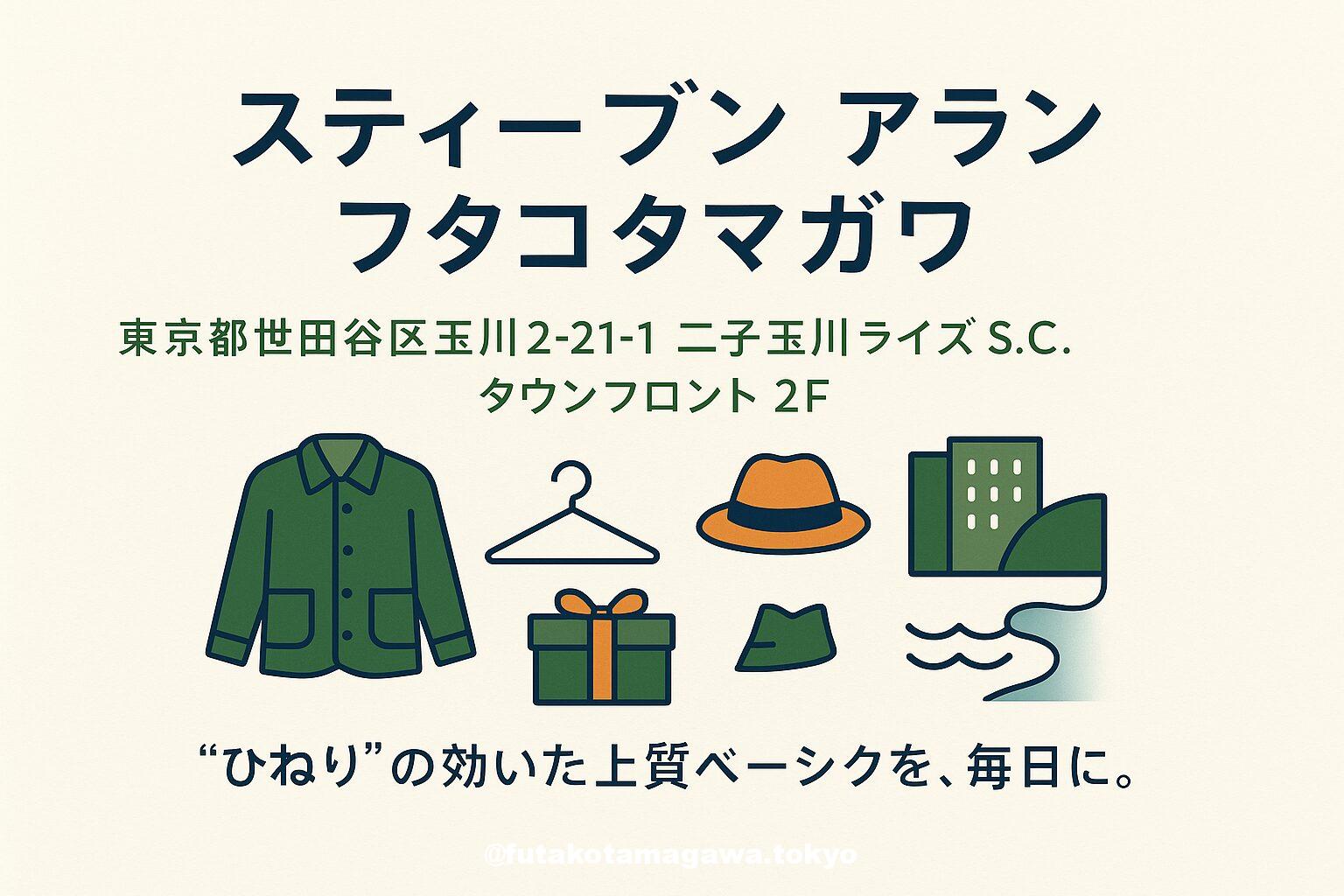 写真 ひとこと紹介文 二子玉川ライズ・タウンフロント2Fの「スティーブン アラン」。上質で心地よい“ひねりの効いたアメリカントラッド”を、メンズ・ウィメンズで提案するセレクトショップ。 地図 AI紹介文(ChatGPT5編) 「スティーブン アラン フタコタマガワ」は、二子玉川ライズ・ショッピングセンターのタウンフロント2Fにある大人向けセレクトショップ。駅直結でアクセスしやすく、買い回りの拠点にも適した立地です。店内にはメンズ・ウィメンズのウエアから小物までが整然と並び、シンプルで着心地のよい“ひねりの ...