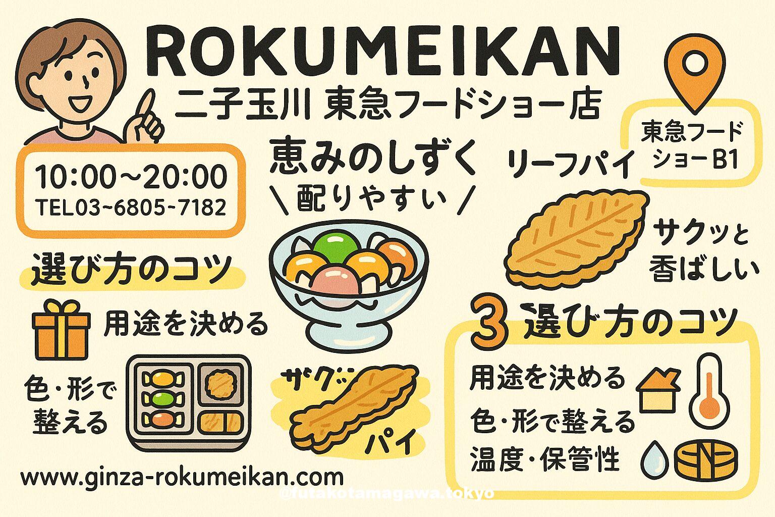 写真 ひとこと紹介文 二子玉川ライズB1「ROKUMEIKAN(鹿鳴館)」は、果実のゼリー〈恵みのしずく/グレースデュー〉やリーフパイで知られる西洋菓子店。手土産から季節の贈り物まで美しく整います。 二子玉川ライズ東急百貨店 地図 AI紹介文(ChatGPT5編) 東急フードショーB1、和洋菓子ゾーンを歩くと、宝石のようにきらめくゼリーが目に入る——それが「ROKUMEIKAN(二子玉川東急フードショー店)」。営業時間は10:00〜20:00、電話は03-6805-7182。駅直結でアクセス良好、急なご挨 ...
