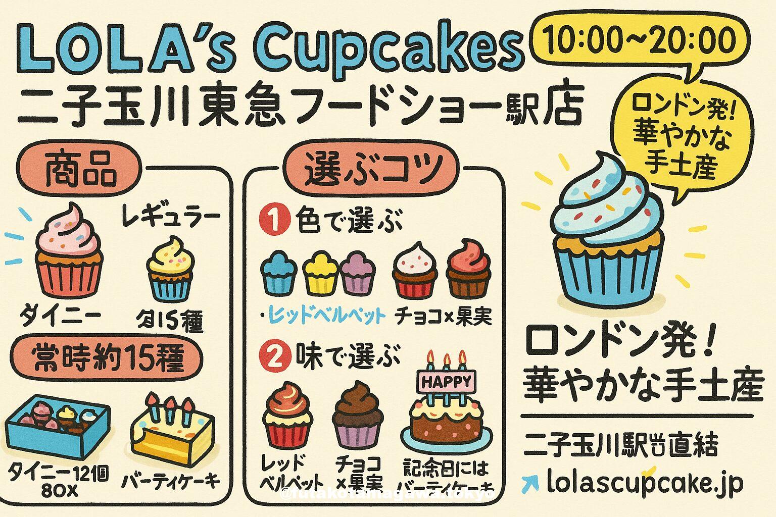 写真 ひとこと紹介文 ロンドン発「LOLA’S」二子玉川。タイニーからレギュラーまで常時約15種、季節限定やオーダーも充実。駅直結B1で、華やかな手土産が“迷わず”見つかる一軒。 二子玉川ライズInstagram 地図 AI紹介文(ChatGPT5編) 二子玉川駅直結、東急フードショーB1にある「LOLA’S Cupcakes Tokyo 二子玉川東急フードショー店」。営業時間は10:00〜20:00、電話は03-6805-7158。駅からの動線上で立ち寄りやすく、急な差し入れや手土産探しにも頼れる立地で ...