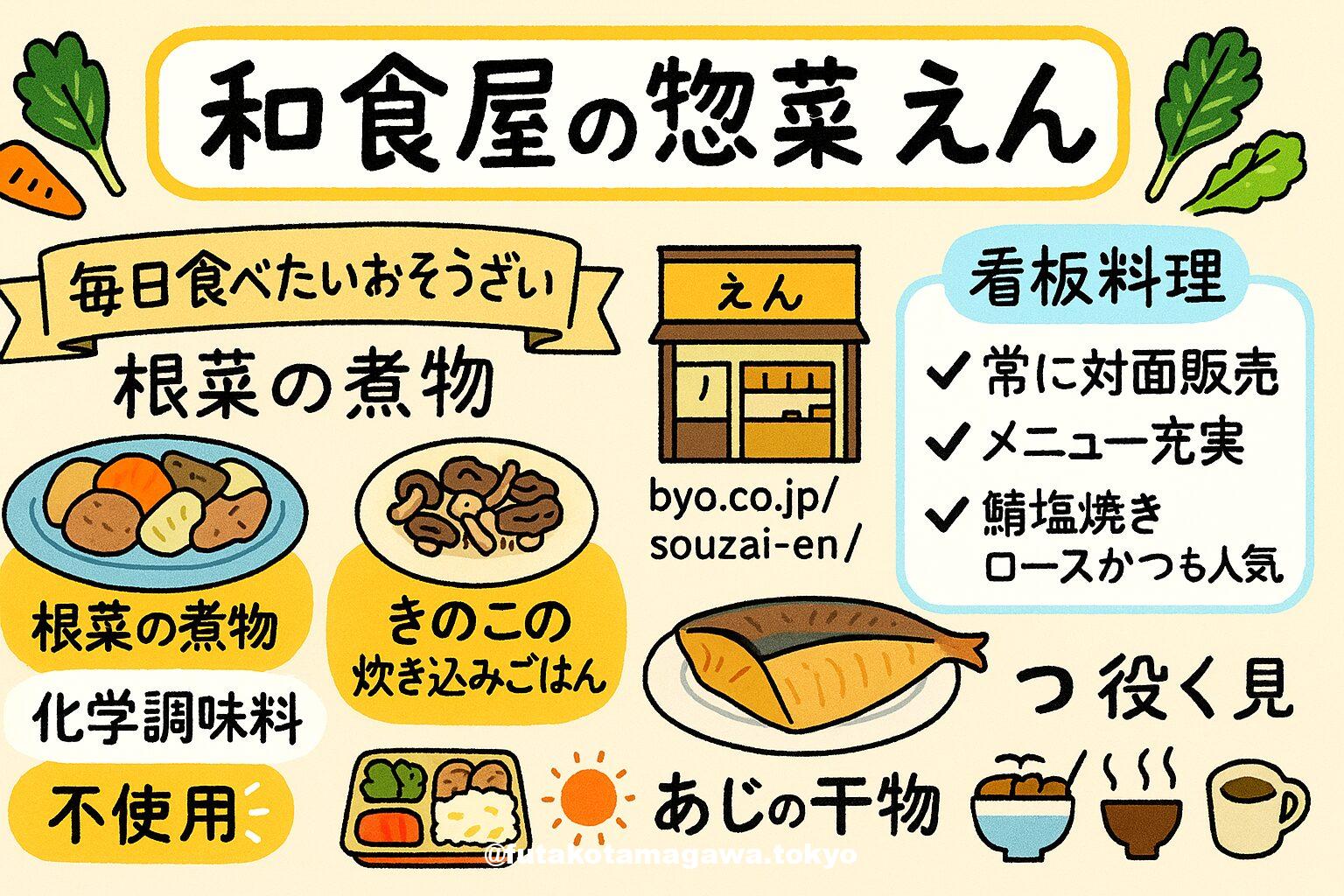 写真 ひとこと紹介文 二子玉川ライズB1「和食屋の惣菜 えん」。店内仕込みの和惣菜とお弁当を、出汁の旨みと四季の素材で。駅直結・10:00〜20:00で頼れる一軒。 二子玉川ライズTokyu Department Store 地図 AI紹介文(ChatGPT5編) 二子玉川ライズ・ショッピングセンターB1、東急フードショーの惣菜ゾーンにある「和食屋の惣菜 えん」。ショーケース越しにふわりと立つ出汁(だし)の香りが、この店の“骨格”を物語ります。掲示にもある通り店内でお作りいたしますのスタイル。煮物・焼き物 ...