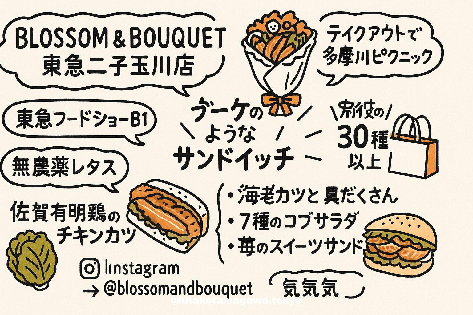 写真 ひとこと紹介文 東急フードショーB1の「ブロッサム&ブーケ」は、無農薬レタスや佐賀有明鶏など厳選素材で作るサンドイッチ専門店。常時30種以上、テイクアウトに最適な“デパ地下ランチ”です。 二子玉川ライズ東急百貨店 地図 AI紹介文(ChatGPT5編) 二子玉川ライズ・ショッピングセンターの東急フードショーB1に構える「BLOSSOM & BOUQUET(ブロッサム&ブーケ)」は、素材の良さを実直に伝えるサンドイッチ専門店です。無農薬レタス、佐賀“骨太有明鶏”のチキンカツなど、選び抜いた食材 ...