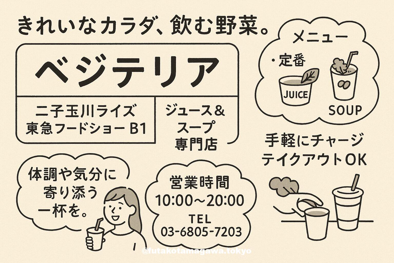 写真 ひとこと紹介文 二子玉川ライズB1「ベジテリア」は、“きれいなカラダ、飲む野菜。”を掲げるジュース&スープ専門店。季節の恵みを一杯に、手早くヘルシーチャージ。二子玉川ライズrockfield.co.jp 地図 AI紹介文(ChatGPT5編) 二子玉川で「今日は体を整えたい」という日に、まっ先に思い出したいのが東急フードショーB1の「ベジテリア」。ブランドのキーワードは“きれいなカラダ、飲む野菜。ジュースとスープを中心に、野菜と果物の持ち味をいちばん良い状態で届けることに徹した、ロック・フィールドの ...