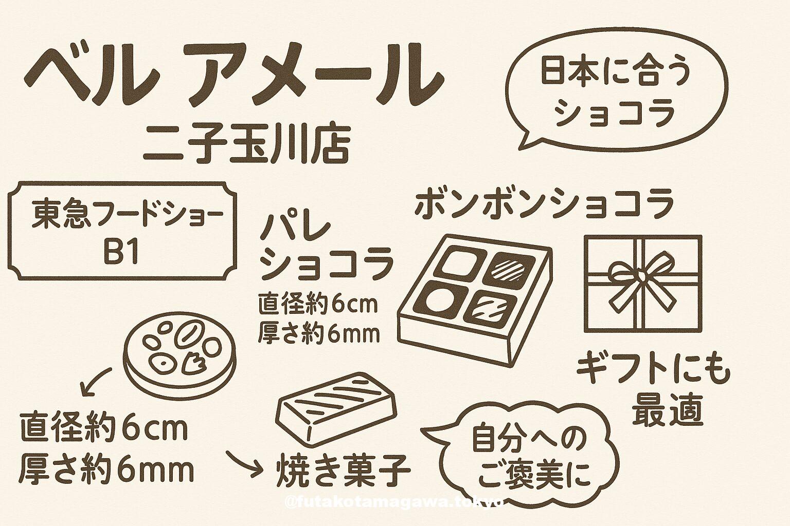 写真 ひとこと紹介文 東急フードショーB1「ベル アメール」は、日本に合う味わいを追求するショコラ専門店。看板の“パレショコラ”は直径約6cm・厚さ約6mm、豊富なバリエで贈り物にも日常のご褒美にも最適。 二子玉川ライズショコラ ベルアメール+1 地図 AI紹介文(ChatGPT5編) 二子玉川ライズ・ショッピングセンターB1、東急フードショーの和洋菓子ゾーンに構える「ベル アメール」。厳選カカオを用いる本格派ショコラ専門店で、10:00〜20:00の通し営業、TELは03-6805-7178。デパ地下ら ...