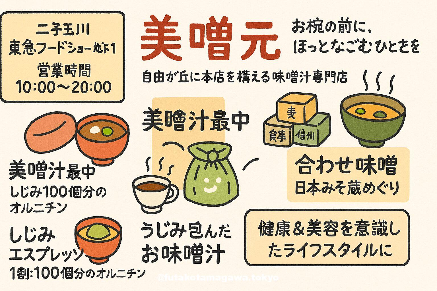 写真 ひとこと紹介文 東急フードショーB1「美噌元」は、“お椀の前に、ほっとなごむひとときを”。自由が丘発の味噌汁専門店が日替わり味噌汁やしじみエスプレッソなど、健康と美を一汁に詰めて提供します。営業時間10:00〜20:00。 美噌元<みそげん> - 自由が丘 味噌汁専門店+15二子玉川ライズ+15Q SKIP(キュースキップ) | 東急線のデジタルチケットサービス+15 地図 AI紹介文(ChatGPT5編) 二子玉川ライズ地下1階、東急フードショーの食紀行ゾーンにある「美噌元(みそげん)」。東京・自 ...