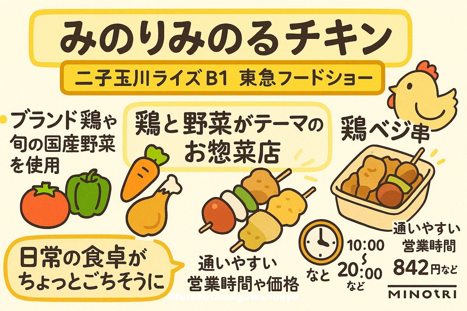 写真 ひとこと紹介文 二子玉川ライズB1「みのりみのるチキン」は、ブランド鶏×全国旬野菜の“鶏ベジ串”やチキン惣菜が人気。焼き鳥やチキンデリが日常の食卓にも小さなごちそうにもぴったりです。営業時間10:00〜20:00。Instagram+8二子玉川ライズ+8全農+8 地図 AI紹介文(ChatGPT5編) 二子玉川ライズ・ショッピングセンターB1、東急フードショーの惣菜ゾーンにある「みのりみのるチキン」は、“鶏と野菜”をテーマにした新感覚のお惣菜ショップです。JA全農とアサヒブロイラーがタッグを組み、“ ...