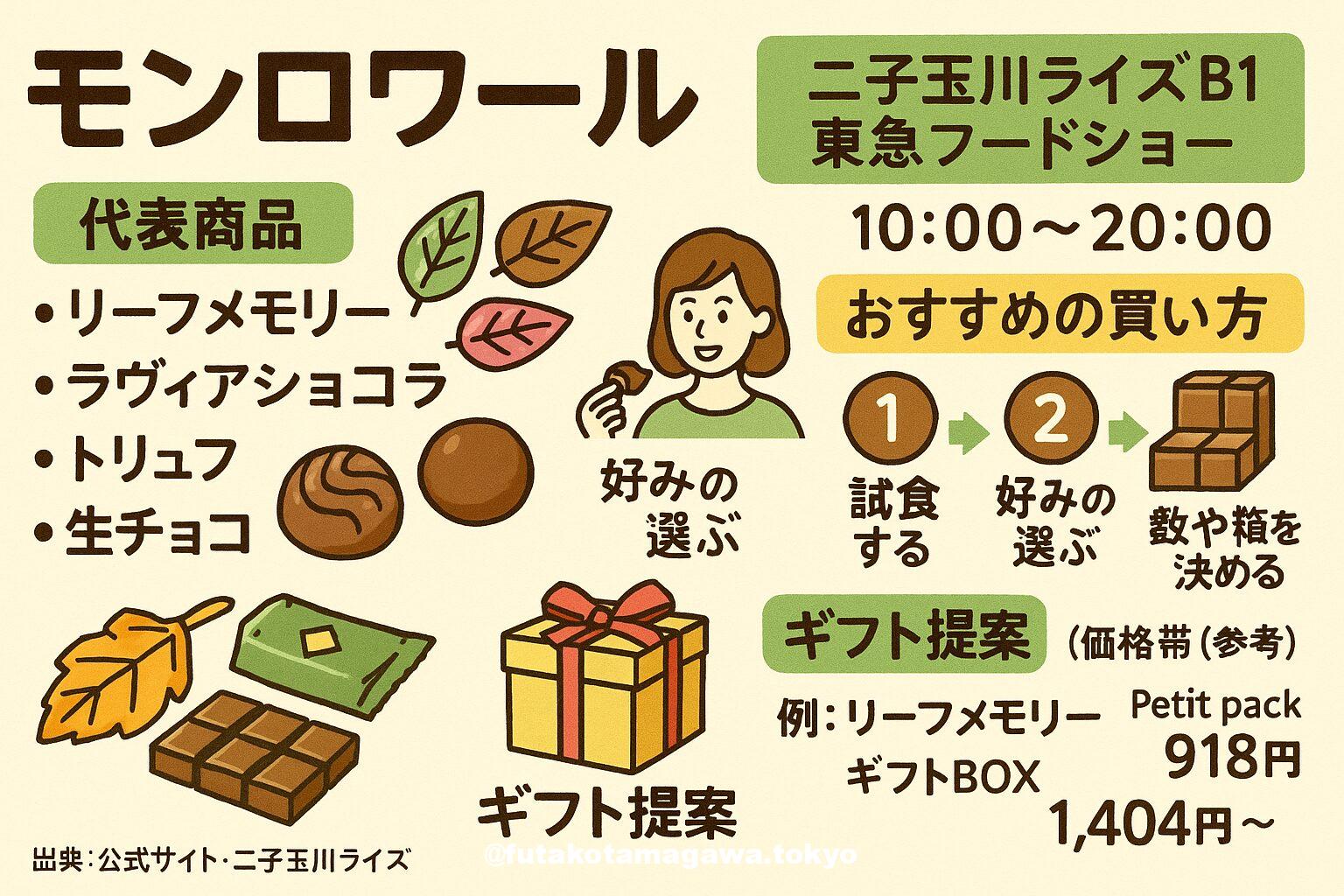 写真 ひとこと紹介文 二子玉川ライズB1「モンロワール」は、葉っぱ型チョコ「リーフメモリー」や割れチョコ「ラヴィアンショコラ」が人気の神戸発ショコラ。10:00〜20:00、手土産に最適です。 東急百貨店二子玉川ライズ 地図 AI紹介文(ChatGPT5編) 二子玉川ライズ・ショッピングセンター地下1階、東急フードショーの洋菓子ゾーンにある「モンロワール 東急二子玉川店」。神戸・岡本生まれのチョコレートハウスが手がける直営ブティックで、日常の“ちょっといい贈り物”から自分へのご褒美まで幅広く応えてくれる存 ...