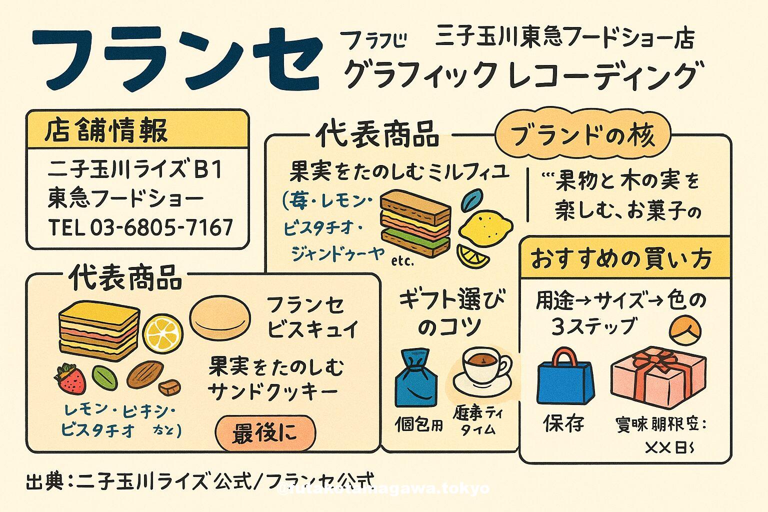 写真 ひとこと紹介文 二子玉川ライズB1「(横濱)フランセ」は、“果実をたのしむミルフィユ”で知られる洋菓子店。レモンケーキやサンドクッキーも揃い、手土産から自分ごほうびまで頼れる一軒です。 二子玉川ライズシュクレイオンラインストア 地図 AI紹介文(ChatGPT5編) 東急フードショーの和洋菓子ゾーンを歩いていると、思わず足が止まる。二子玉川ライズ地下1階「フランセ(二子玉川東急フードショー店)」は、1957年創業の横浜発ブランド。店名表記は施設ガイド上「横濱フランセ」。営業時間は10:00〜20:0 ...